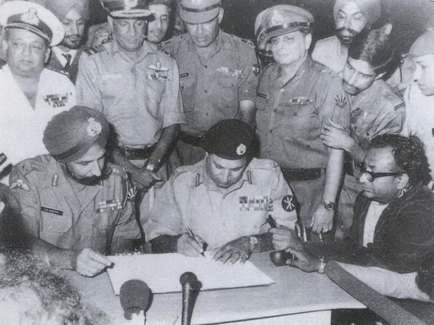ഒടുവിൽ ഇന്റ്യനാർമിയുടെ കിഴക്കൻ കമാന്റന്റും മുക്തി ബാഹിനിയും ചേർന്ന് 1971 ഡിസംബർ 16 ന് തലസ്താനമായ ധാക്ക പാക്കിസ്താനി പട്ടാളത്തിൽ നിന്ന് പിടിച്ചെടുത്തു.ഡിസംബർ 26 ന് നാടുകടത്തിയിരുന്ന രാഷ്ട്രീയ നേതാക്കൾ കിഴക്കൻ പാക്കിസ്ഥാനിൽ തിരിച്ചെത്തി ബംഗാളികളുടെ നാട് എന്നർത്ഥമുള്ള ‘ബംഗ്ലാദേശ്’ എന്ന പുതുരാജ്യം രൂപീകൃതമായി. ലോകത്തിന് മുന്നിൽ.നാണം കെട്ട് 93,000 പാക്കിസ്താനി പട്ടാളക്കാർ ഇന്റ്യക്കു മുന്നിൽ കീഴടങ്ങി. (ആ കലിപ്പ് അവന്മാർക്കിന്നും മാറിയിട്ടില്ലെന്നത് ചരിത്രം). യുദ്ധത്തിലെ തോൽവിക്ക് ശേഷം പാക്കിസ്ഥാന്റെ ലഫ്റ്റനന്റ് ജനറൽ എ.എ.കെ നിയാസി ഇന്റ്യയുടെ ലഫ്റ്റനന്റ് ജനറൽ ജെ.എസ്സ് അറോറയുടെ മുന്നിൽ 93,000 പാക്കിസ്ഥാനി പട്ടാളത്തിന്റെ ജീവനുവേണ്ടിയാചിച്ചുകൊണ്ടു സമാധാന ഉടമ്പടിയിൽ ഒപ്പ് വെക്കുകയും ചെയ്തു.