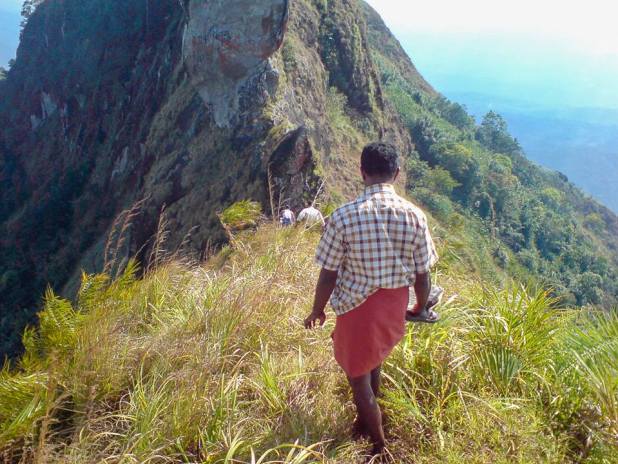 പക്ഷേ എങ്ങിനെ…? മുകളിലേക്ക് കയറാൻ പ്രയാസപ്പെട്ട ആ പാറയിലൂടെ തിരിച്ചിറങ്ങുന്ന കാര്യം എനിക്ക് ചിന്തിക്കാൻ പോലുമായില്ല. അതിലെ ഇറങ്ങില്ലെന്ന് ഞാൻ തീർത്തു പറഞ്ഞു. അടുക്കം ഭാഗത്തേക്കുള്ള ചെരുവിലൂടെ പുല്ലിന്റെ കുറ്റിയിൽ ചവിട്ടി അല്പം താഴേക്ക് ഇറങ്ങിയാൽ മല ചുറ്റി പാറ ഒഴിവാക്കി എത്താം എന്ന് തോന്നി. പക്ഷേ അതിന് റിസ്ക് കൂടുതലാണ്.എങ്കിലും പിടിക്കാൻ പുല്ലും കുറ്റിയുമൊക്കെ ഉണ്ടെന്ന സമാധാനമുണ്ട്. പതിയെ ഇറങ്ങി തുടങ്ങി. മുന്നിൽ സജനാണ്. അല്പം സാഹസവും ഉണ്ട് ആൾക്ക്. ഒരു നിമിഷത്തെ ശ്രദ്ധ തെറ്റിയ സമയം ചവിട്ടിയിരുന്ന പുല്ലിന്റെ കുറ്റിസഹിതം ഇടിഞ്ഞ് സജൻ താഴേക്ക് പോയി. ഞങ്ങൾ അലറിവിളിച്ചു. ഭാഗ്യത്തിന് മറ്റൊരു ചെടിയിൽ പിടുത്തം കിട്ടി. ഗിരീഷ് അല്പം സാഹസികമായി താഴെയിറങ്ങി സജനെ സഹായിക്കാൻ ചെന്നു. ഇതൊന്നും വിഷയമല്ലെന്ന രീതിയിൽ ആൾ വീണ്ടും കയറി വരുന്നു.