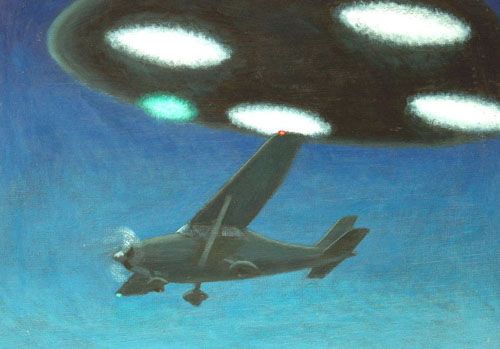 ഫെഡറിക്ക് : സ്ഥിരീകരിക്കാൻ സാധിക്കുന്നില്ല .. അസാമാന്യ വേഗതയാണ് അതിന് . ഈ ഭാഗത്ത് എയർ ഫോഴ്സ് വിമാനങ്ങൾ ഉണ്ടോ ? സ്റ്റീവ് : ഞങ്ങളുടെ അറിവിൽ ഇല്ല . ഫെഡറിക്ക് : അത് കിഴക്ക് നിന്നും വളരെ വേഗത്തിൽ എന്നെ സമീപിക്കുകയാണ് …… ഇപ്പോൾ എന്റെ മുകളിൽ ഉണ്ട് . അവൻ ഗെയിം കളിയ്ക്കുകയാണോ ? രണ്ടു മൂന്ന് തവണ എന്റെ നേരെ മുകളിൽ വന്നു ………….. സ്റ്റീവ് : നിങ്ങൾ ഏതു ഉയരത്തിൽ ആണ് ഇപ്പോൾ ഉള്ളത് ? ഫെഡറിക്ക് : നാലായിരത്തി അഞ്ഞൂറ് . നില്ക്കൂ ……….. അതൊരു വിമാനം ആണെന്ന് തോന്നുന്നില്ല !! ……………………………. അതൊരു …………….