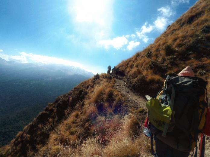 മൊട്ടക്കുന്നിന് മുകളിലൂടെ സൂര്യൻ ഉദിച്ച് ഉയരുംമ്പോഴേക്കും രണ്ടാം ദിവസത്തെ യാത്ര ആരംഭിച്ചിരുന്നു. ഒരു കിലോമീറ്ററോളും വരുന്ന റിഡ്ജാണ് ഇന്നത്തെ പ്രധാന കടമ്പ. കഷ്ടിച്ചു ഒരാൾക്ക് പോകാവുന്ന വഴി, മറുവശത്ത് ആഴമേറിയ ഗർത്തം. വലിയ ബാക്ക് പാക്കും പേറി ഈ വഴിയുടെ നടക്കുക എന്നതാന്ന് ഈ ട്രെക്കിലെ സാഹസികത. ഈ റൂട്ടിൽ വെള്ളത്തിന്റെ സ്രോതസ്സ് വളരെ കുറവാണ്, ആയതിനാൽ റിഡ്ജിന് അരികിലുള്ള തടാകത്തിൽ നിന്ന് വെള്ളം നിറക്കാനായി പ്രിയ സുഹൃത്തിനോട് ഞാൻ ആവിശ്യപ്പെട്ടു. പറയാൻ മറന്നു പോയി! ഈ യാത്രയിൽ ഞാൻ തനിച്ചായിരുന്നില്ല. എന്റെ കൂടെ അവനുമുണ്ടായിരുന്നു, പ്രിയ സുഹൃത്ത്. തണ്ണുപ്പിനോട് അലർജിയുള്ള, ലേശം ആവേശം കൂടുതലുള്ള പ്രിയ മിത്രം Renjith Krishnaswamy.